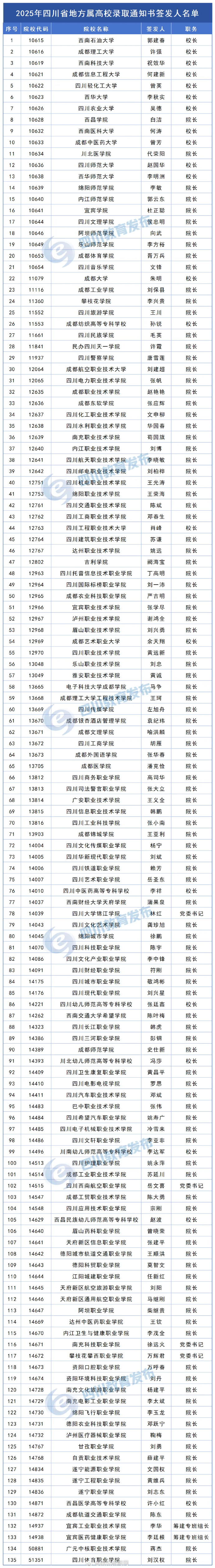 按照《教育部关于做好2025年普通高校招生工作的通知》(教学〔2025〕1号)要求,我省今年继续实行校长签发录取通知书制度,普通高校录取通知书除加盖高校校章外,还应由校(院)长或授权签发人签发,并对录取结果负责。现将我省具有普通高等教育招生资格的地方属高等学校录取通知书签发人名单汇总公布如下(共135所)。