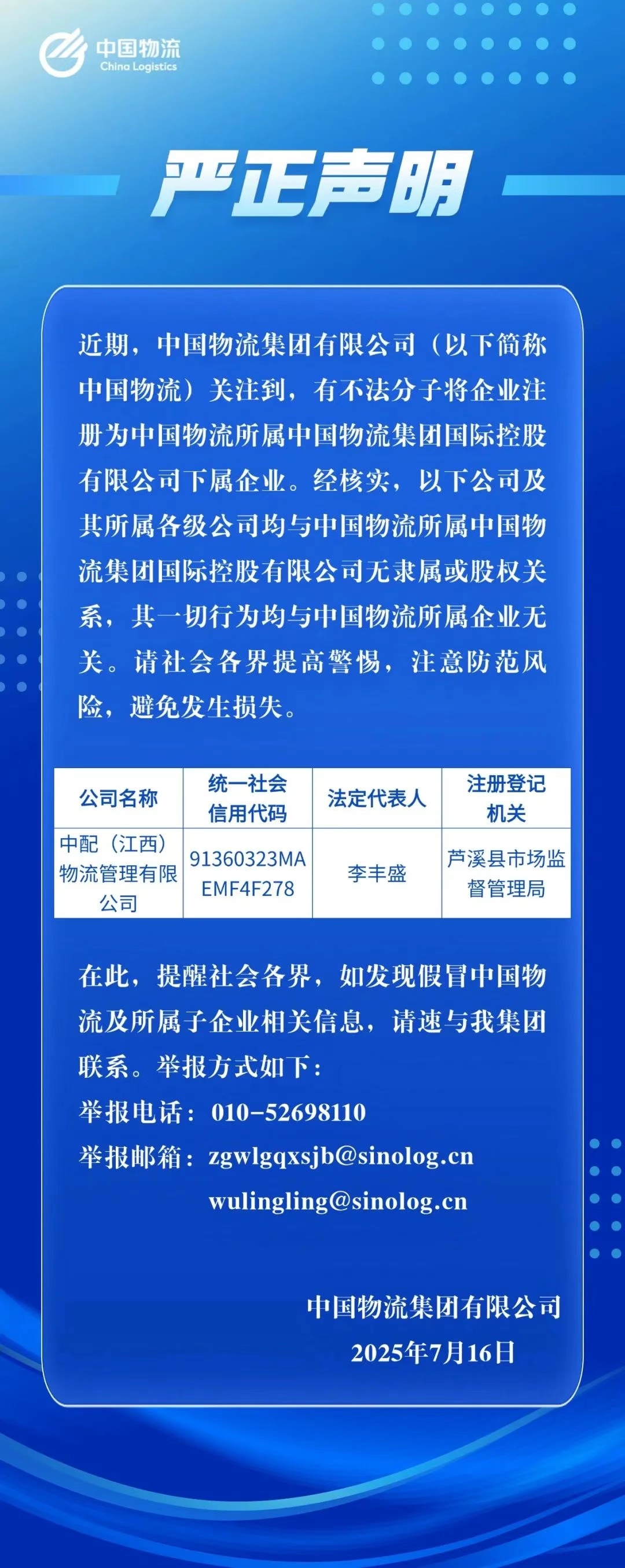 中国物流集团发布严正声明