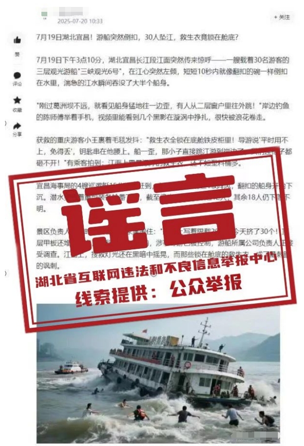 近日,有网民发布“湖北宜昌游船突然倒扣,30人坠江”的图文信息。经海事部门核实,网传信息系谣言。