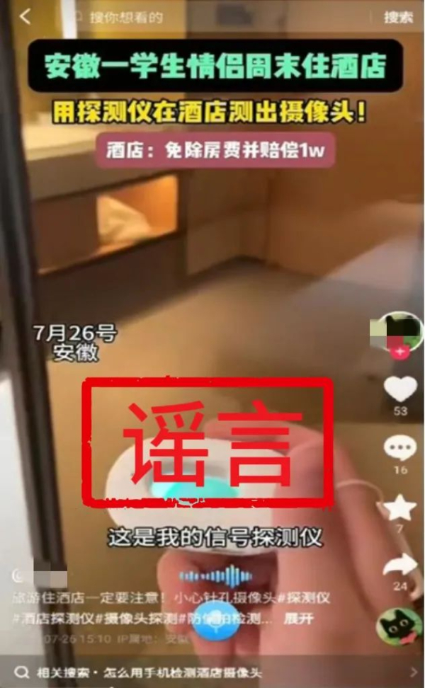 近日,蚌埠公安网安部门查明,刘某某为活跃账号,吸粉引流,在某短视频平台发布“安徽一学生情侣周末住酒店用探测仪在酒店测出摄像头并报警处理,酒店回应:免除房费并赔偿1万元”的不实言论,公安机关依法对刘某某予以行政处罚。 二、随某某编造不实水灾网络谣言案