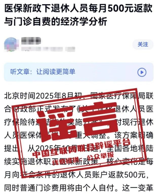 “医保新政下退休人员每月500元返款”相关信息系谣言 2025-08-25 16:25