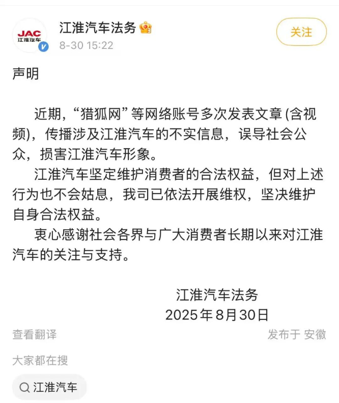 而在前一天的8月30日,@江淮汽车法务 发布声明:近期,“猎狐网”等网络账号多次发表文章(含视频),传播涉及江淮汽车的不实信息,误导社会公众,损害江淮汽车形象。江淮汽车坚定维护消费者的合法权益,但对上述行为也不会姑息,我司已依法开展维权,坚决维护自身合法权益。