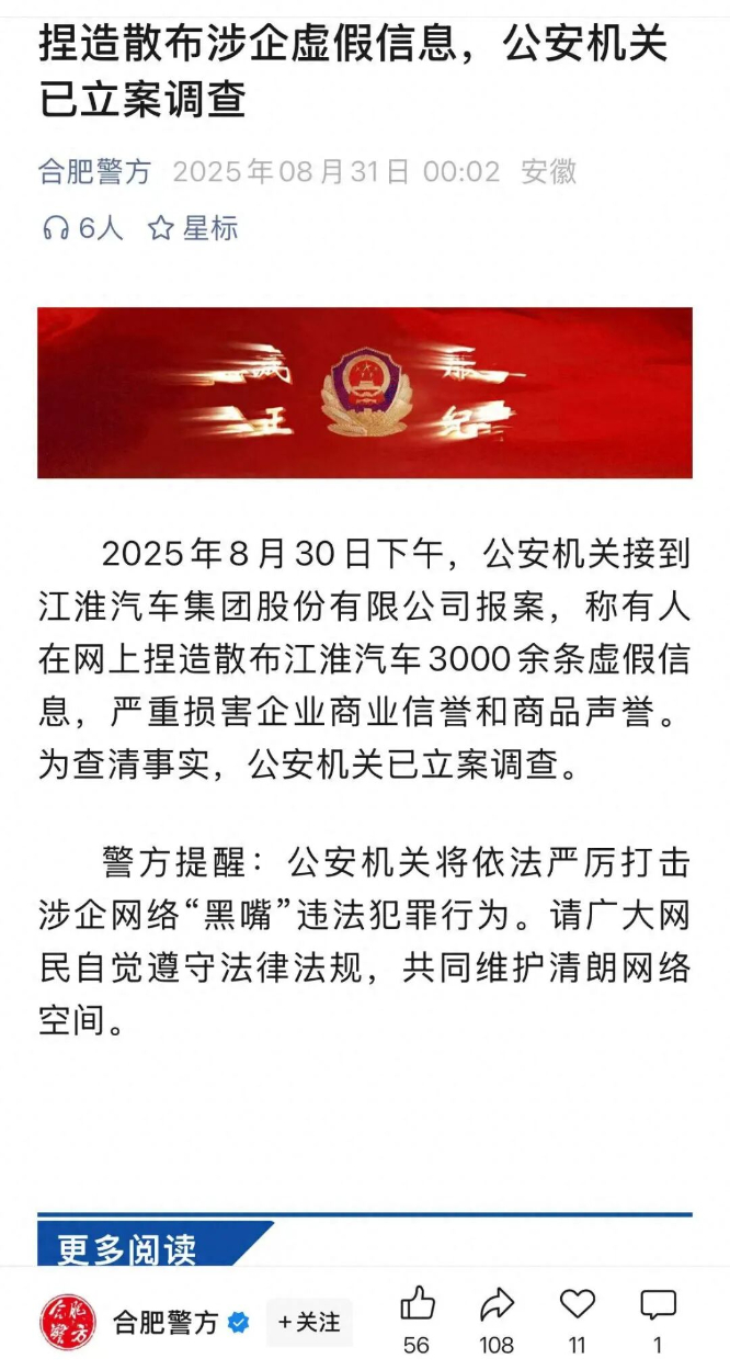 8月31日凌晨,“合肥警方”微信公众号发文称,2025年8月30日下午,公安机关接到江淮汽车集团股份有限公司报案,称有人在网上捏造散布江淮汽车3000余条虚假信息,严重损害企业商业信誉和商品声誉。为查清事实,公安机关已立案调查。