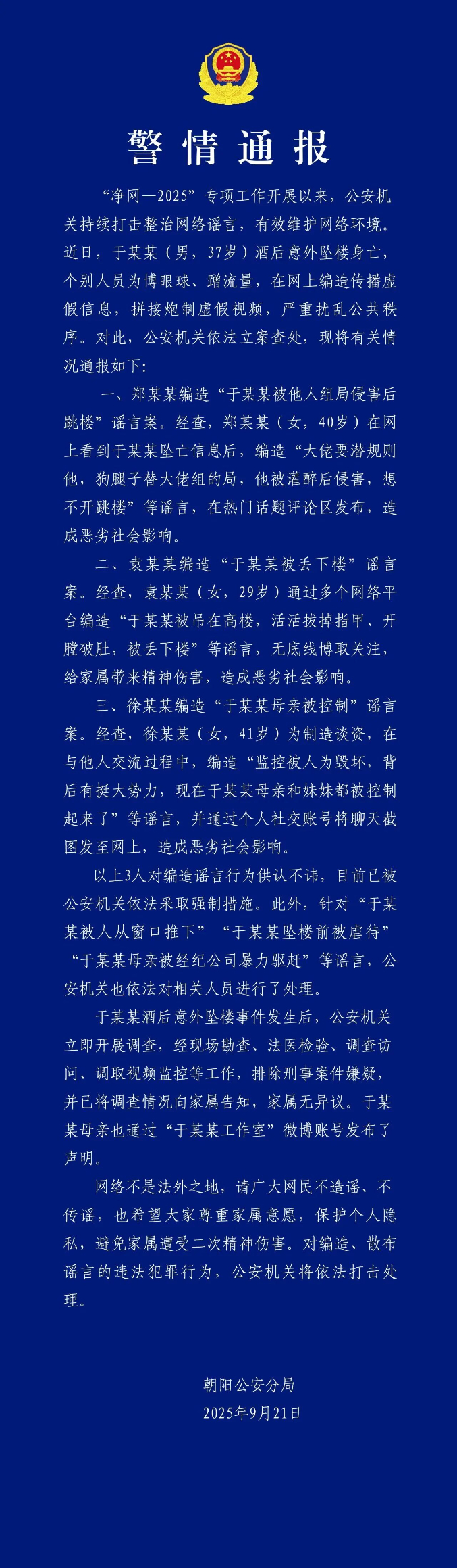 9月21日,北京朝阳公安分局就于某某酒后意外坠楼身亡事件发布警情通报,全文如下: