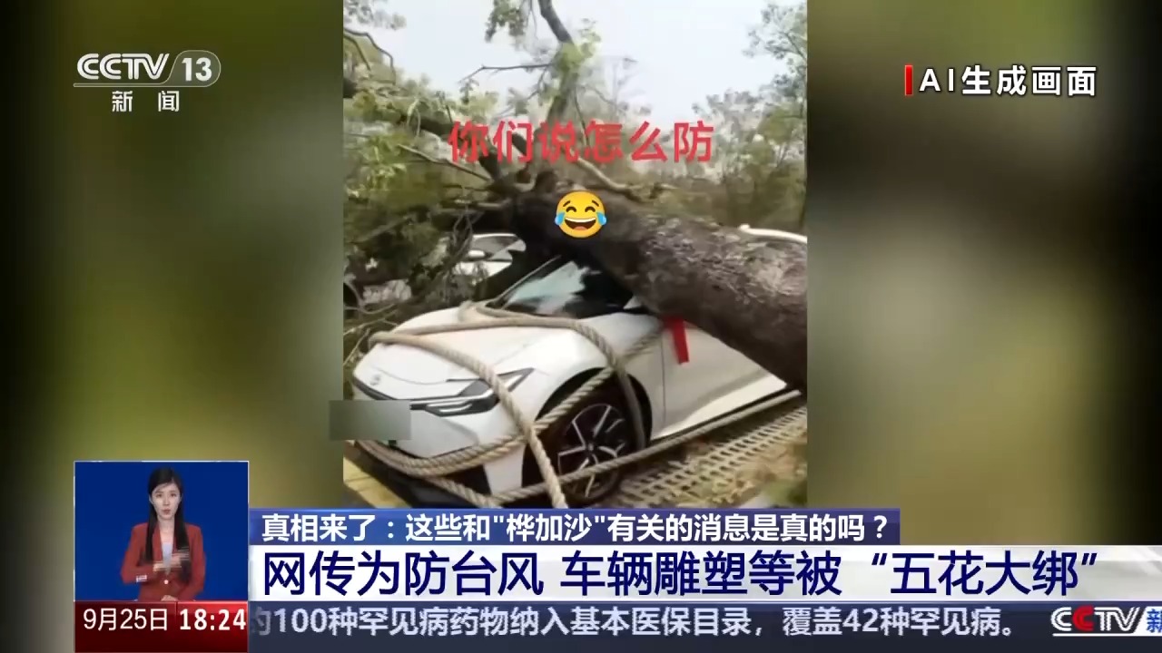 为防台风车辆“五花大绑”?这些图都是假的! 2025-09-26 08:02 粉碎谣言,真相来了!这些和“桦加沙”有关的消息是真的吗? 网传为防台风 车辆雕塑等被“五花大绑” 台风“桦加沙”来势汹汹,不少广东朋友纷纷在社交平台上晒出自家防台风措施,如封闭窗户、把阳台上的物品挪进室内等。其中一些图片引发关注。 如有图片显示,车主为防止车辆被台风吹走,用麻绳将车子捆绑固定在地面,被网友称为“五花大绑”。更有图片显示,被“五花大绑”的车辆最终被倒伏的大树砸到。