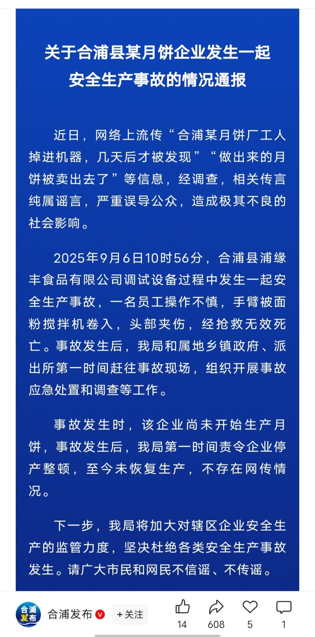 工人掉进搅拌机做出的月饼被卖出?合浦辟谣:事发时尚未生产月饼 2025-09-29 18:00 一则聊天截图在网络上流传,称广西北海市合浦县“有个工人掉进月饼机器搅拌机里,几天才知道,做出来的月饼被卖出去了”。 9月29日,澎湃新闻记者就此事联系合浦县应急管理局,对方称以后续发布的官方通报为准。 29日下午14时许,“合浦发布”就此事发布通报:“近日,网络上流传合浦某月饼厂工人掉进机器,几天后才被发现”“做出来的月饼被卖出去了等信息,经调查,相关传言纯属谣言,严重误导公众,造成极其不良的社会影响。2025年9月6日10时56分,合浦县浦缘丰食品有限公司调试设备过程中发生一起安全生产事故,一名员工操作不慎,手臂被面粉搅拌机卷入,头部夹伤,经抢救无效死亡。事故发生后,我局和属地乡镇政府、派出所第一时间赶往事故现场,组织开展事故应急处置和调查等工作。事故发生时,该企业尚未开始生产月饼,事故发生后,我局第一时间责令企业停产整顿,至今未恢复生产,不存在网传情况。”