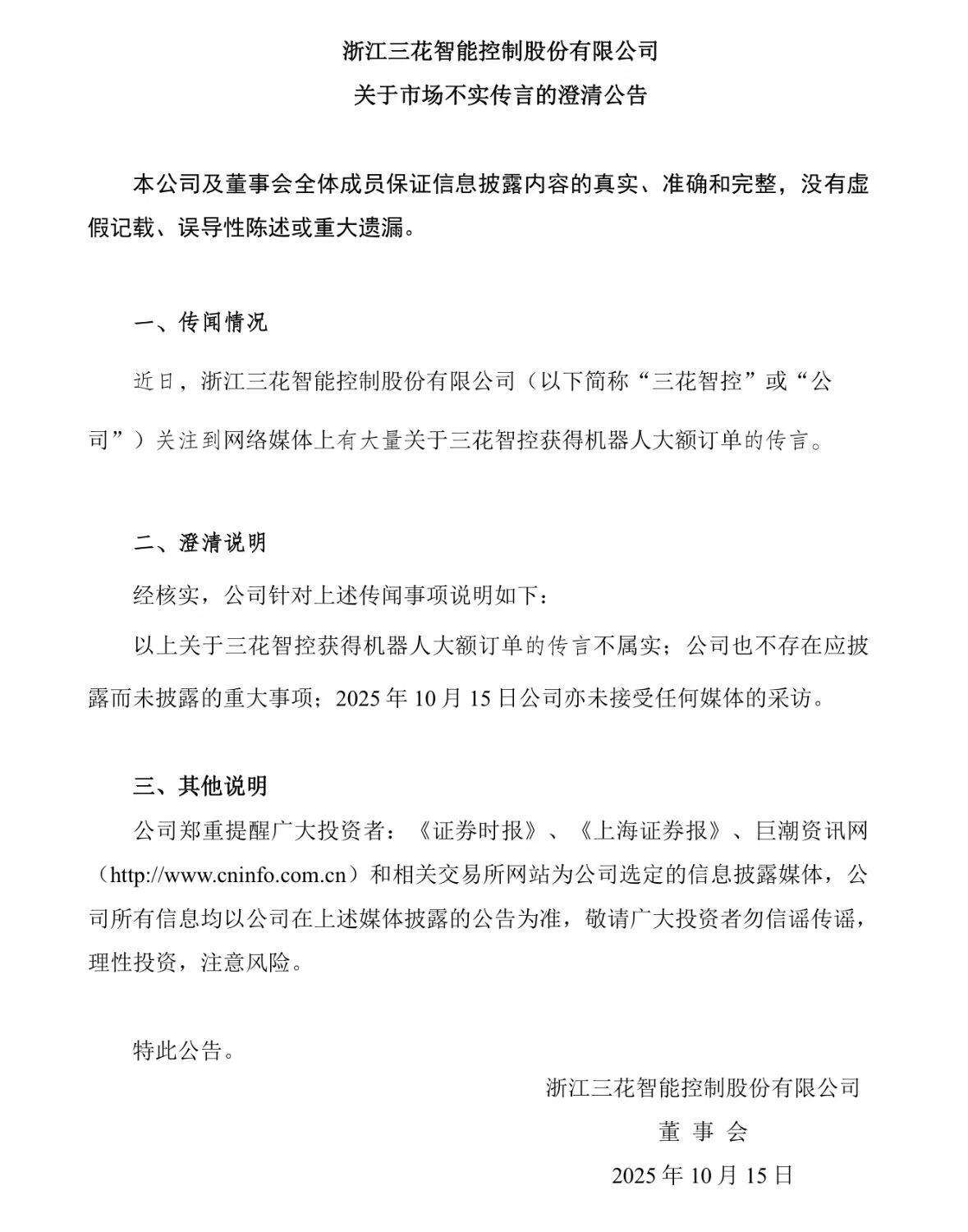 昨日晚间,三花智控(002050.SZ)公告称,近日关注到网络媒体上有大量关于公司获得机器人大额订单的传言,经核实,该传言不属实;公司也不存在应披露而未披露的重大事项;2025年10月15日公司亦未接受任何媒体的采访。