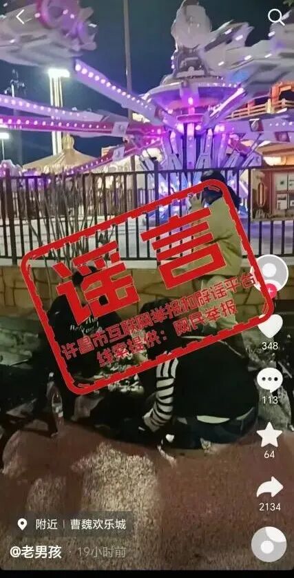 近日,某平台账号“老男孩”发布视频称“许昌曹魏欢乐城疑似有人从游乐设施上甩下来”,经核实,视频中女士突因身体不适坐在地上,在原地休息后自行离开,视频内容为不实信息。目前,该视频已删除。