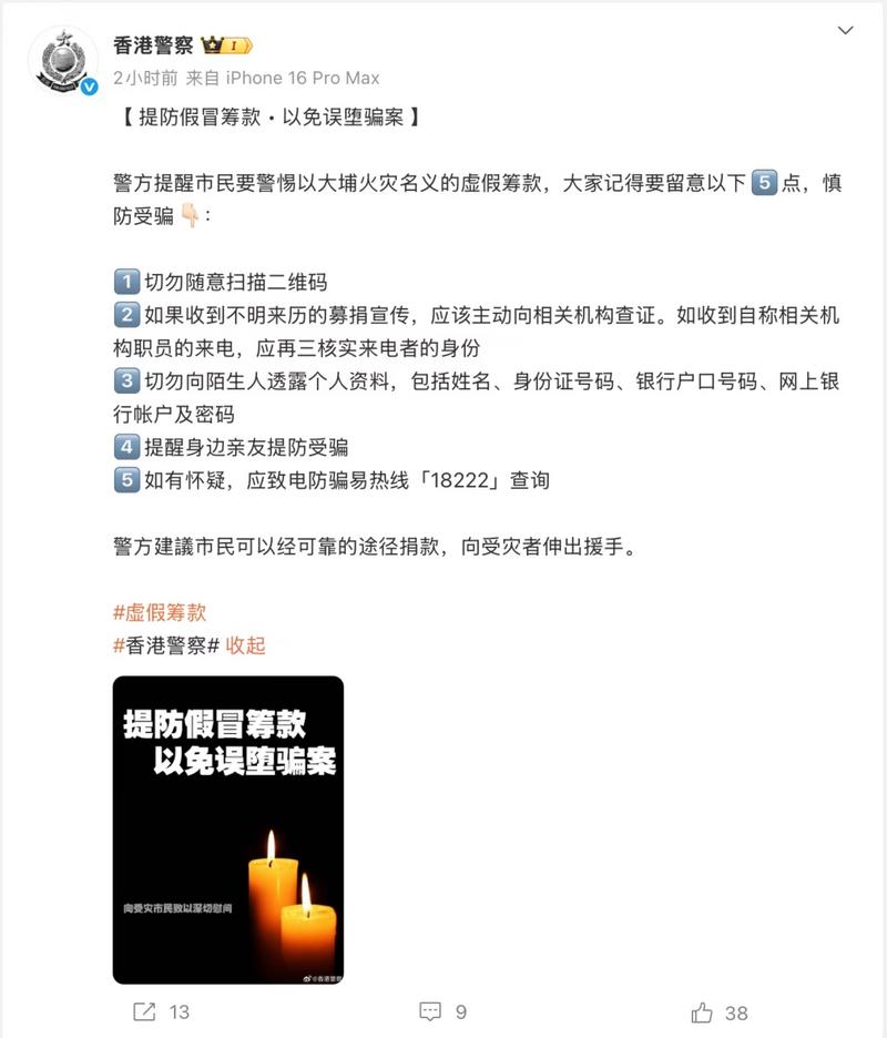 11月27日,香港警方在微博发文,提醒市民要警惕以大埔火灾名义的虚假筹款,注意以下5点,慎防受骗: