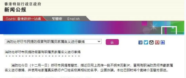 紧急提醒!有人冒用香港殉职消防员家属募捐 2025-12-02 11:16 据香港特区政府新闻公报消息,12月1日,香港消防处呼吁市民提高警觉,称近日网上流传一段不明来历视频,冒用殉职消防员何伟豪家属名义进行募捐,并使用与家属真实银行户口姓名极其相似的名字,企图诈骗。目前,消防处已实时将个案转至警方跟进。