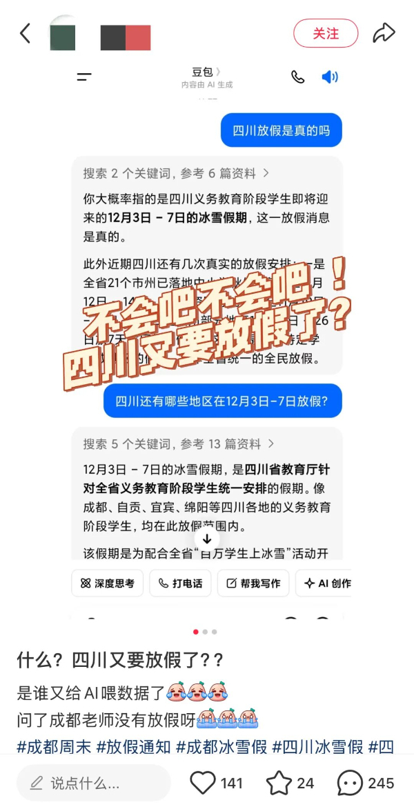 不少本地网友第一反应:“才放了秋假,不可能吧?”“成都很少下雪,还放雪假?”多数声音认为,这极有可能是一则假消息,很可能由AI生成。