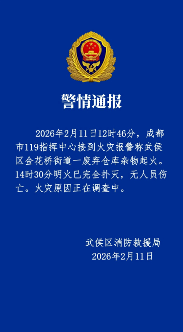 11日14时47分,四川成都武侯区消防救援局发布警情通报称,武侯区金花桥街道一废弃仓库杂物起火,14时30分明火已完全扑灭,无人员伤亡。另据成都双流国际机场核实,机场北围界外约2公里处发生火情,未对机场运行造成影响,航班起降正常。
