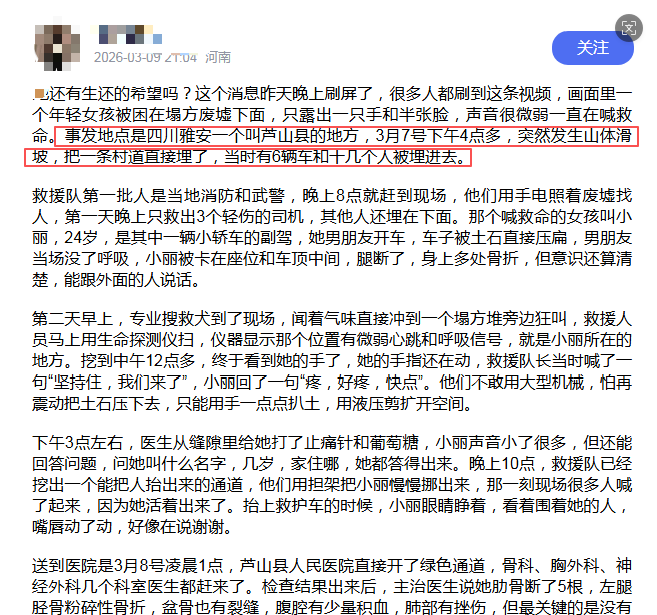 四川芦山山体滑坡,女孩被困废墟待救援?权威回应来了! 2026-03-12 15:45 3月9日,有网民发帖称:“她还有生还的希望吗?这个消息昨天晚上刷屏了,很多人都刷到这条视频,画面里一个年轻女孩被困在塌方废墟下面,只露出一只手和半张脸,声音很微弱一直在喊救命。事发地点是四川雅安一个叫芦山县的地方,3月7号下午4点多,突然发生山体滑坡,把一条村道直接埋了,当时有6辆车和十几个人被埋进去”。