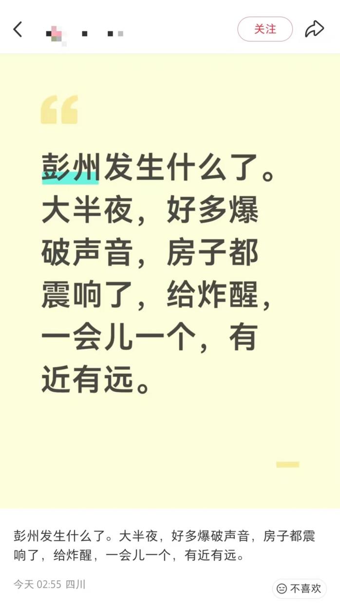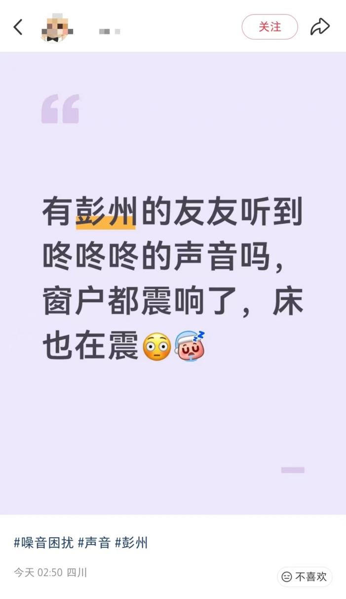 近日,有四川彭州附近网民在网络平台反映,夜间不时听到“咚咚响”“类似爆破声”的声响,并担心是否会影响房屋安全,引发关注。