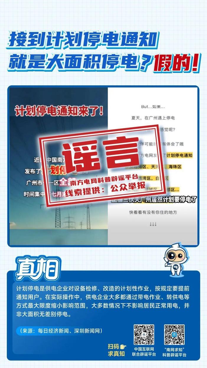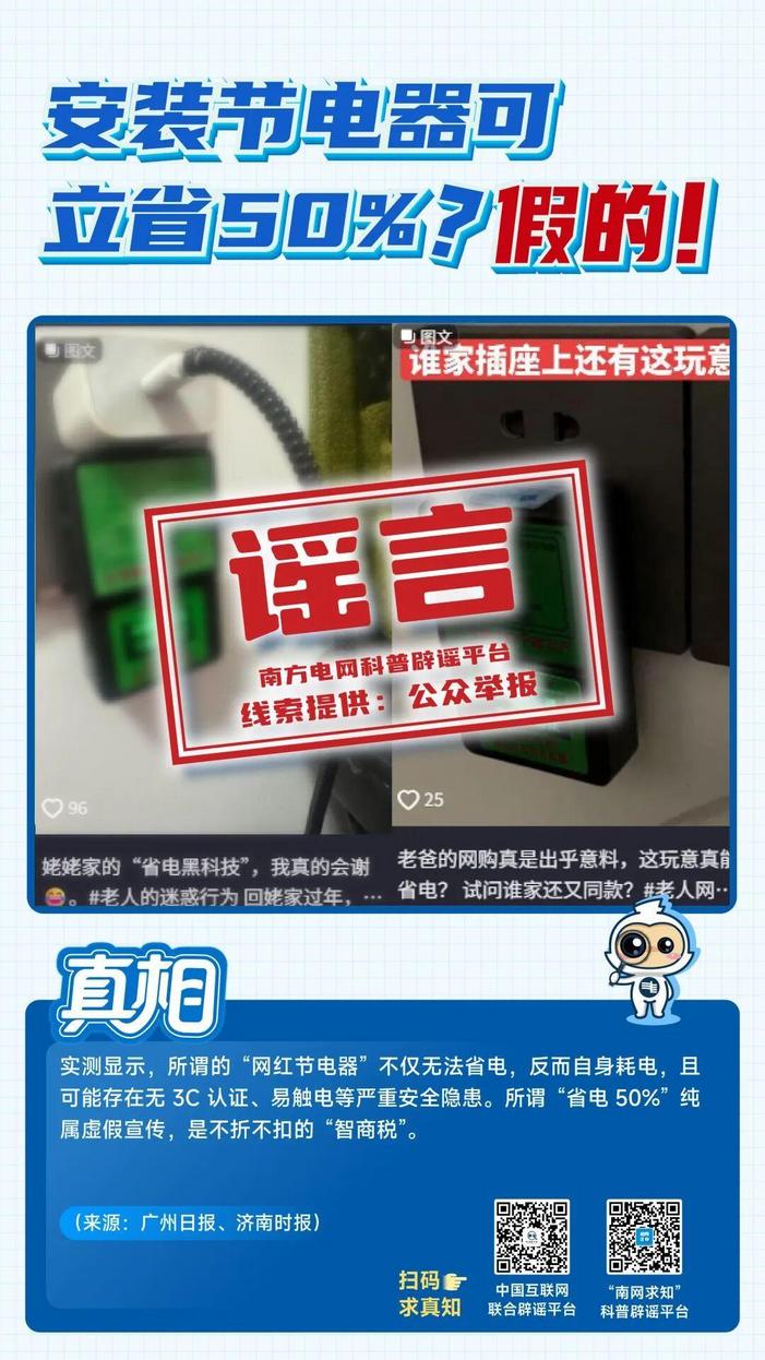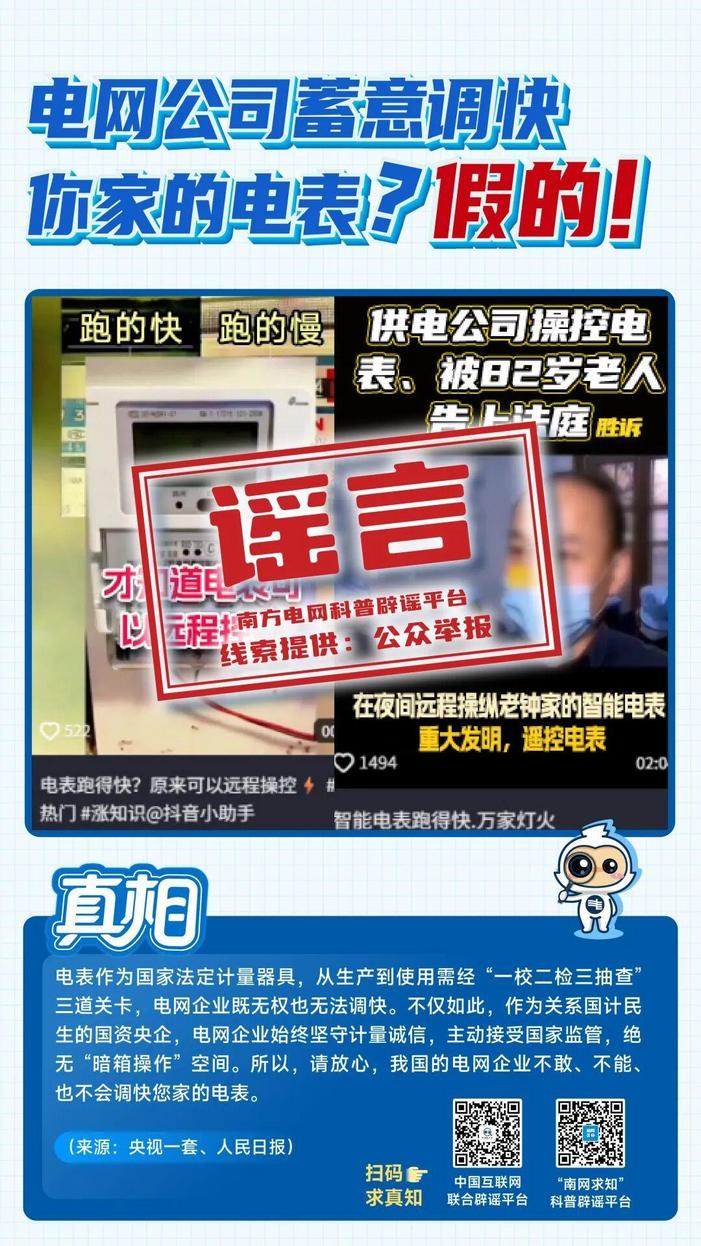 在“3·15”国际消费者权益日到来之际,中国互联网联合辟谣平台与南方电网科普辟谣平台“南网求知”联合发布八大典型电力谣言,帮助广大群众远离谣言误导、维护自身权益。