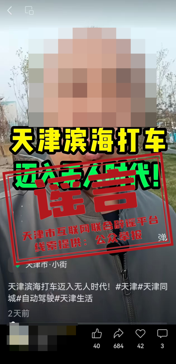 经与交通运输部门核实,天津市滨海新区目前暂无无人驾驶出租汽车运营,视频中相关信息不实。