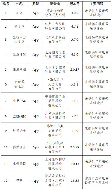 四、初念、零零汽等12款App未提供有效账号注销途径或为用户注销账号设置不合理条件(详见下表)。
