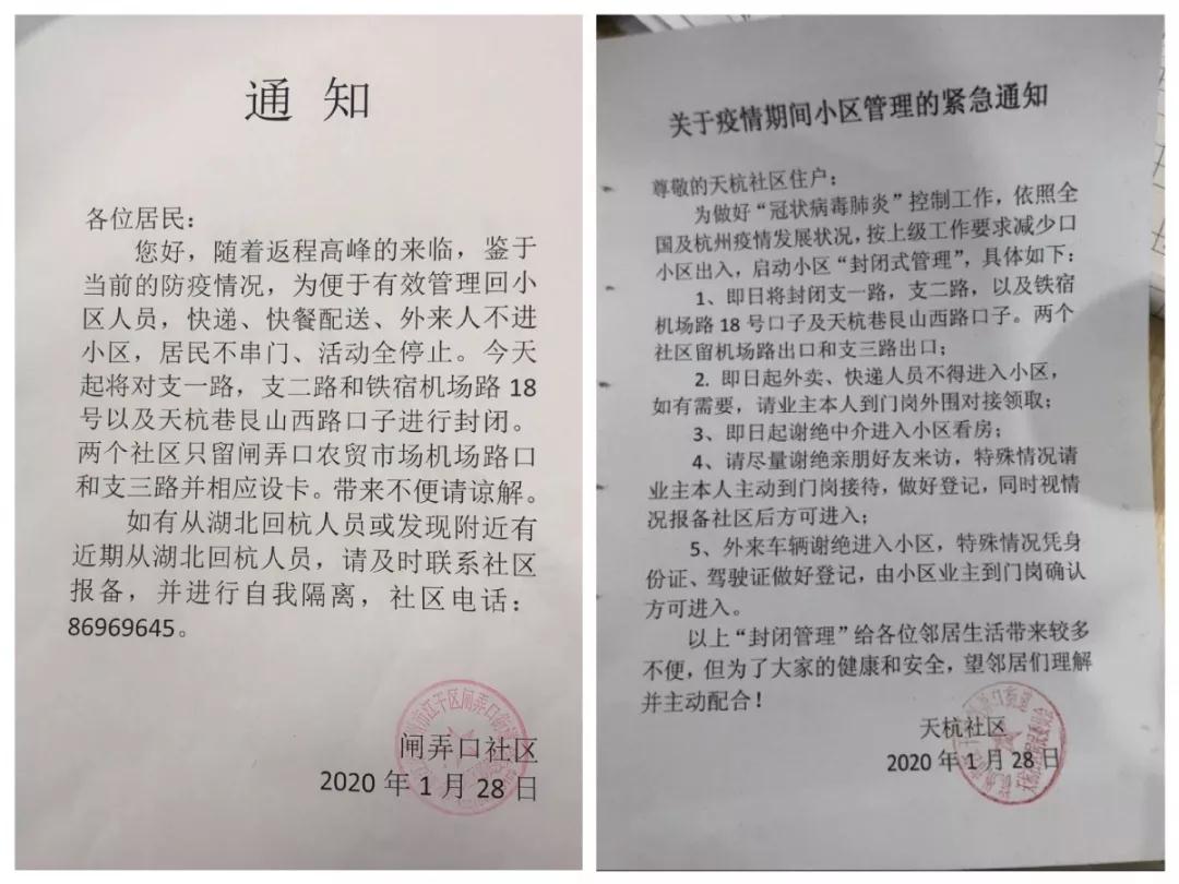 自28日起对支一路,支二路和铁宿机场路18号以及天杭巷艮山西路口,25幢、27幢行人出入口,运河公园出入口进行封闭,两个社区分别留下闸弄口农贸市场机场路口和支三路口的大门,并相应设卡,对出入来往人员进行测温、记录,快递、外卖不得进入小区。