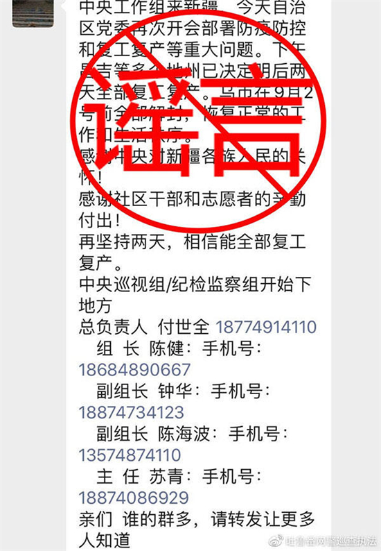 近日,有网传消息称“中央工作组来新疆……”,并附有“工作组领导”电话。对此,吐鲁番市公安局网络安全保卫支队辟谣:经查,此信息纯属谣言,系对2019年已被多个省市辟谣的虚假信息进行恶意篡改,所附电话号码均为骚扰电话或诈骗电话。