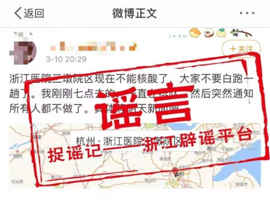 3月10日晚,网络流传“浙江医院三墩院区不能做核酸了”“浙江医院被封,有两例疑似”等多条传言。经记者核实,浙江医院目前一切正常,相关传言不实!疫情防控期间,请大家继续做好自我防护,不信谣不传谣,一切以官方发布为准!
